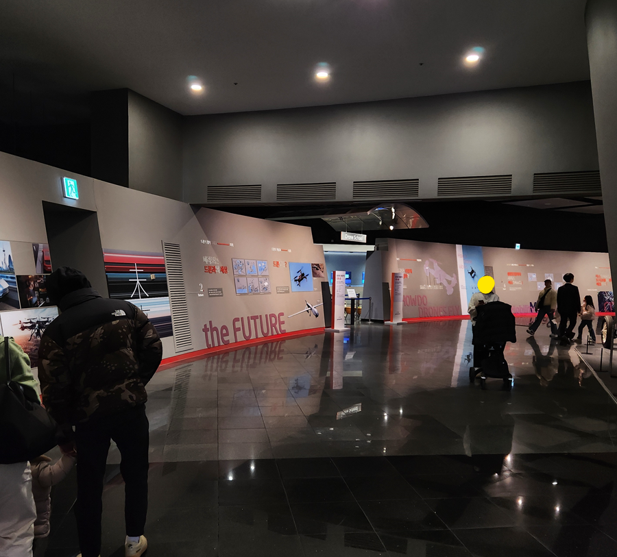 1층은 주로 체험 공간으로 구성되어 있습니다. 입장하면 바로 눈에 들어오는 대형 드론 전시장이 인상적이에요.