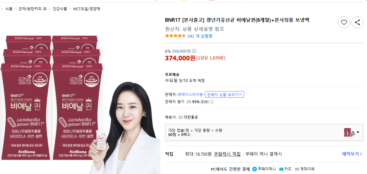 | 비에날 퀸 | 캡슐형 | 60캡슐 (1개월) | 유산균 + 갱년기 케어 (회화나무열매) 포함 | ₩48,830 (할인가) |