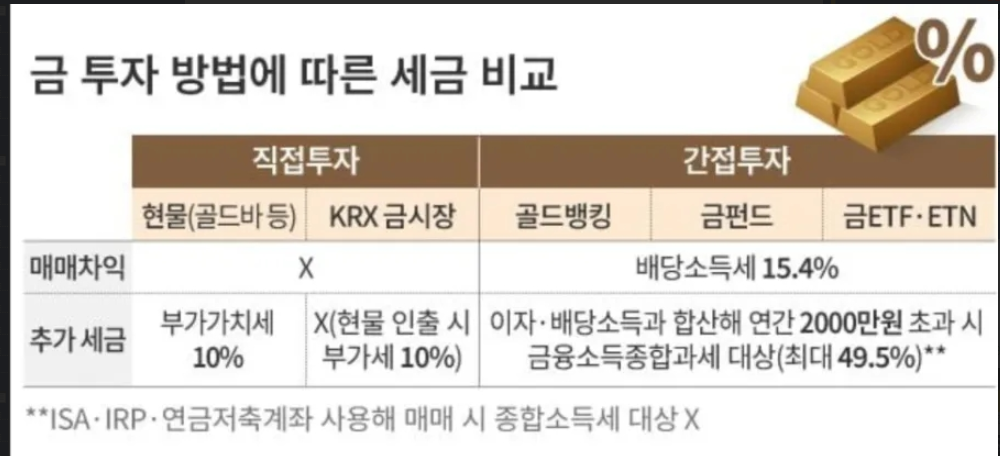 2) 부가가치세: 실물 금을 구입할 때는 10%의 부가세가 붙습니다. 하지만 한국거래소(KRX) 금시장에서 거래할 경우 부가세가 면제되어 세금 절감 효과가 큽니다.