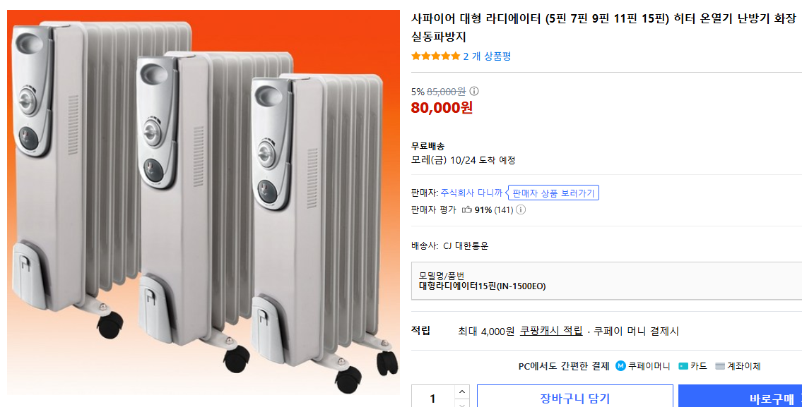 라디에이터 방식의 난로는 뜨겁게 달궈진 오일이나 금속 파이프를 통해 천천히 열을 내보내는 구조라 은은하고 오랫동안 따뜻함이 유지됩니다. 사파이어 IN-1500EO 모델은 1500W 출력으로 방 하나를 충분히 덥힐 수 있는 성능을 갖추었으면서도 가격이 10만 원이 채 되지 않아 합리적입니다.