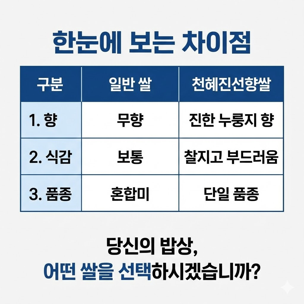 | 항목 | 일반 쌀 (혼합미) | 천혜진선향쌀 |