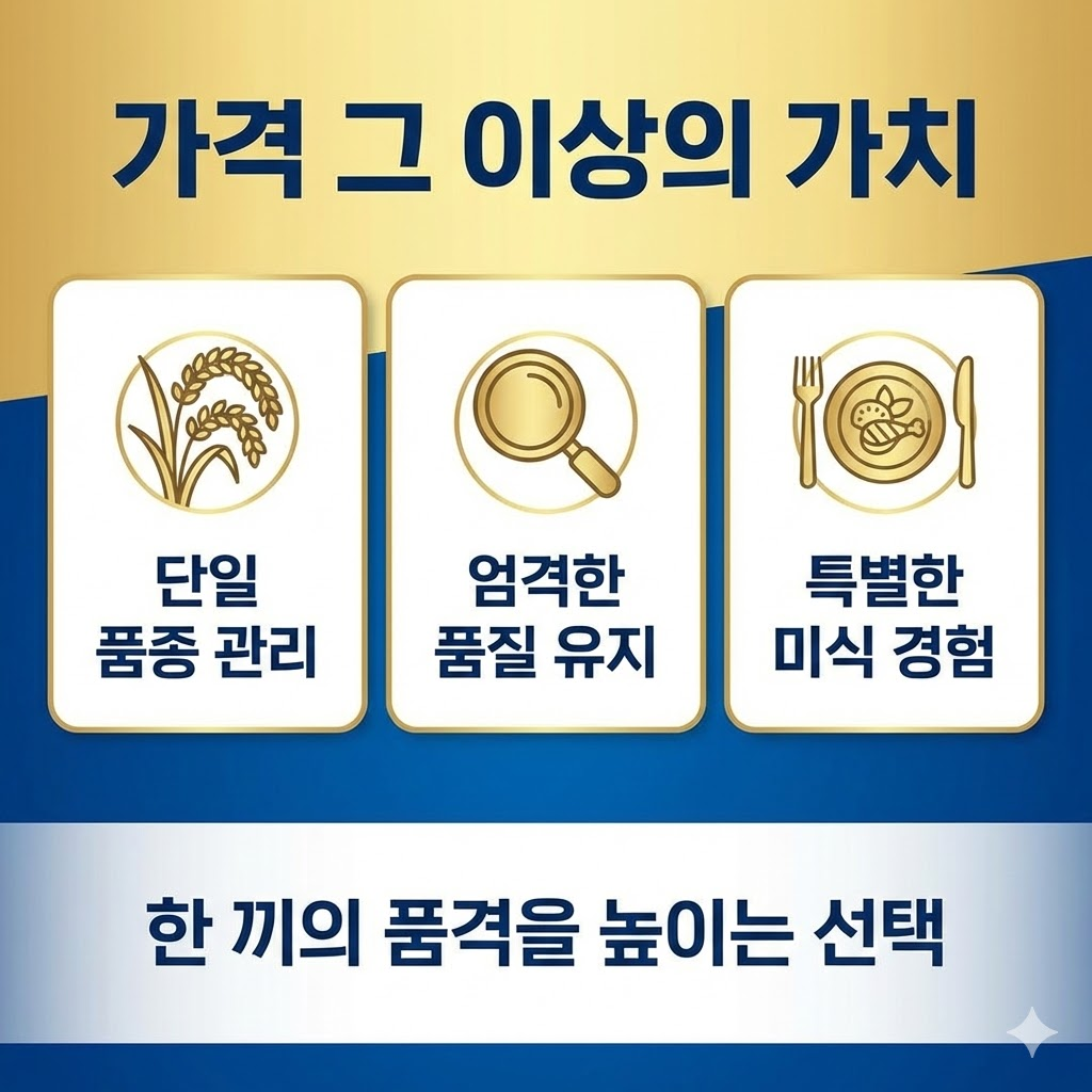 첫째, 종자 사용료와 저작권 때문입니다. 국내 독자 개발 품종으로 철저하게 등록된 농가에서만 종자를 보급받아 재배할 수 있습니다. 둘째, 소량 생산 및 품질 선별 과정입니다. 대량으로 쏟아내는 일반 쌀과 달리 수확 후 단백질 함량, 수분 함량 등을 정밀 분석하여 기준에 미달하는 쌀은 과감히 배제합니다.