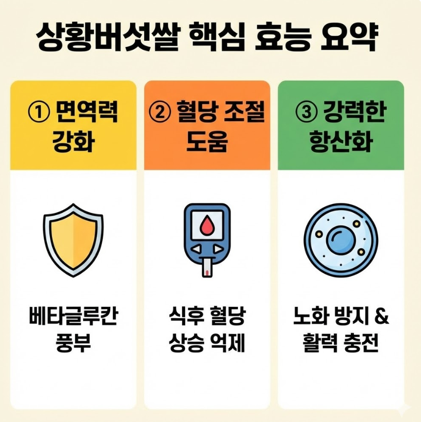 최근 건강한 식단에 대한 관심이 높아지면서 단순히 배를 채우는 밥이 아닌, 영양을 더한 '기능성 쌀'이 주목받고 있습니다. 그중에서도 '상황버섯쌀'은 신비의 약용 버섯이라 불리는 상황버섯의 유효 성분을 쌀에 입혀, 매일 먹는 주식을 통해 건강을 챙길 수 있다는 점에서 큰 인기를 끌고 있습니다. 오늘은 상황버섯쌀이 구체적으로 어떤 효능을 가지고 있는지, 특히 면역력과 혈당 관리에 얼마나 도움이 되는지 상세히 알아보겠습니다.