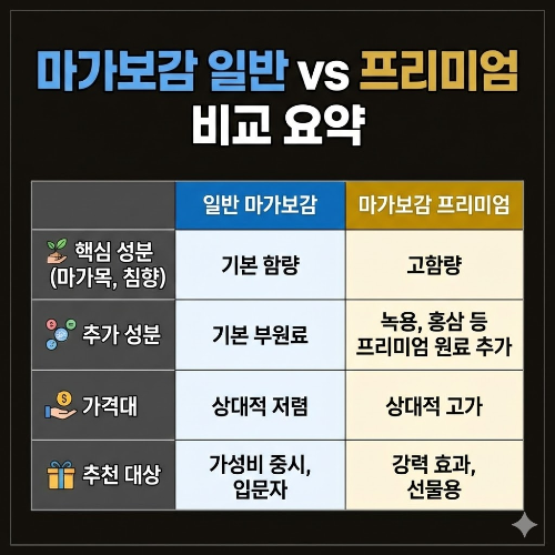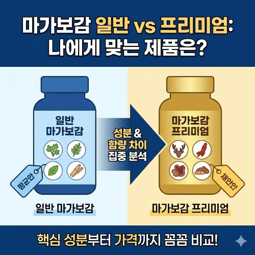 마가보감 일반과 프리미엄의 선택 기준은 간단합니다. **'꾸준한 건강 관리'가 목적이라면 '일반 제품'**으로 시작하고, **'저하된 기력의 적극적인 개선'이나 '특별한 선물'이 목적이라면 '프리미엄 제품'**이 정답입니다.