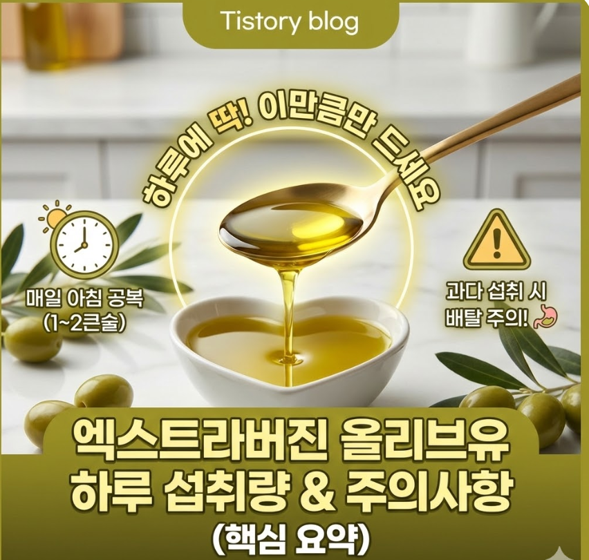 건강을 위해 시작한 올리브유 섭취, 욕심내지 말고 '하루 2스푼'만 기억하세요. 내 몸의 상태를 살피며 적절히 조절할 때 비로소 엑스트라버진 올리브유의 진정한 효능을 누릴 수 있습니다. 꾸준함과 적절함이 건강의 핵심입니다.