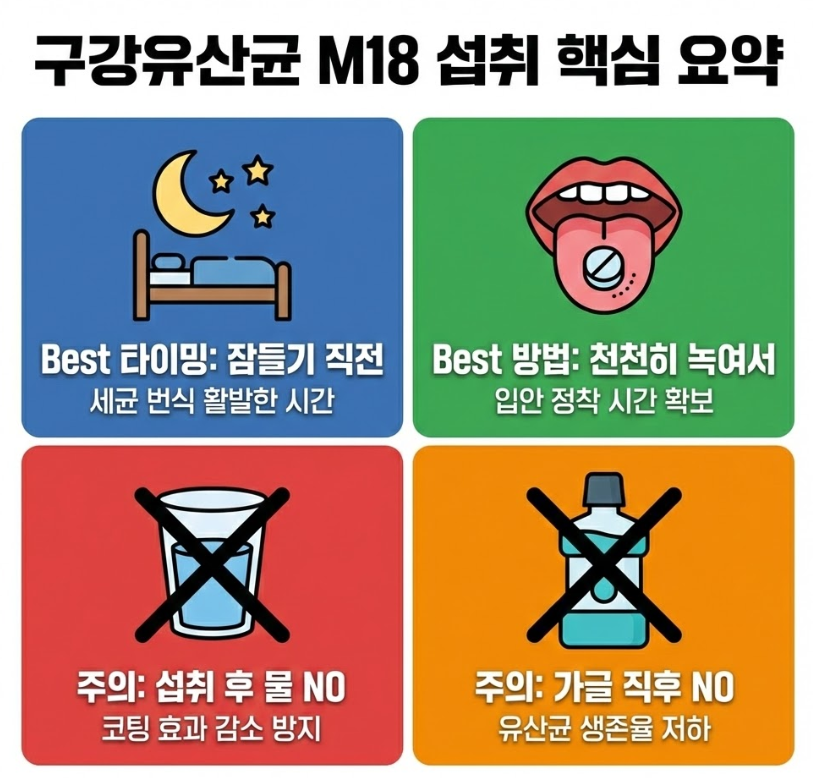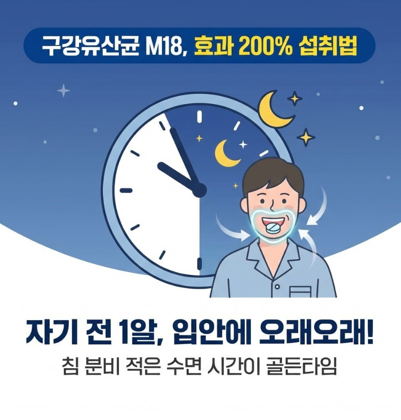 구강유산균 M18은 '무엇을' 먹느냐보다 '어떻게' 먹느냐가 훨씬 중요한 제품입니다. "잠들기 전, 천천히 녹여서, 물 없이" 이 세 가지 원칙만 기억하신다면, 구강유산균의 효과를 제대로 경험하실 수 있을 것입니다. 오늘 밤부터 올바른 섭취 습관으로 건강한 구강 환경을 만들어보세요.