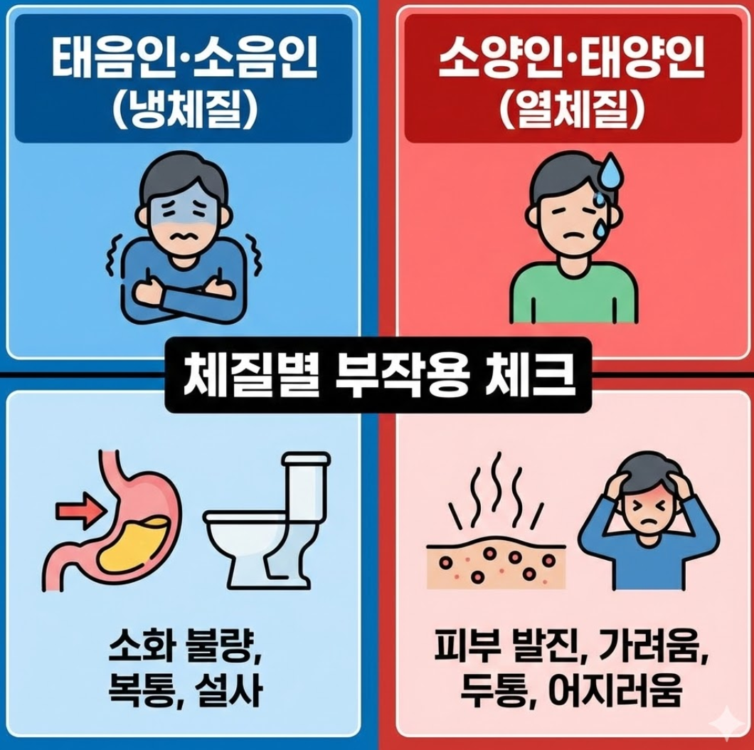 - 태양인/소양인 (열이 많은 체질): [주의 필요] 몸에 열이 많아 더위를 많이 타는 분들은 과다 섭취 시 상열감(얼굴이 화끈거림)을 느낄 수 있습니다.