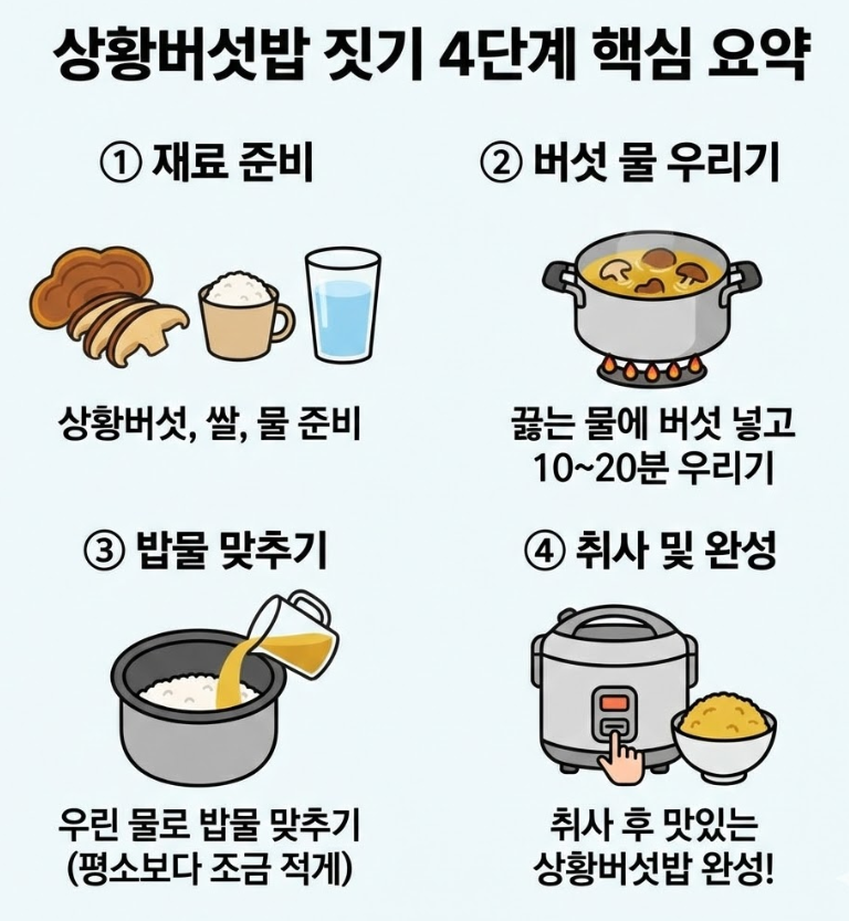 꿀팁: 밥을 지을 때 소주 한 잔(약 50ml)을 넣으면 상황버섯의 항산화 성분인 폴리페놀이 더 잘 우러나와 영양 가치가 올라간다는 연구 결과가 있습니다.