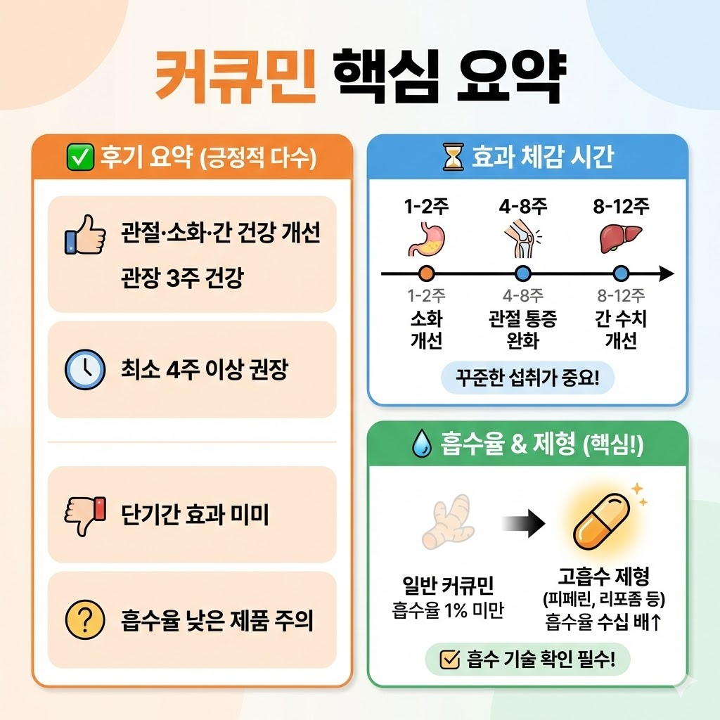 실제 복용 후기들을 종합해 보면, 커큐민은 올바른 제품을 선택하고 꾸준히 복용했을 때 효과를 볼 수 있는 영양제입니다. 핵심 내용을 정리하면: