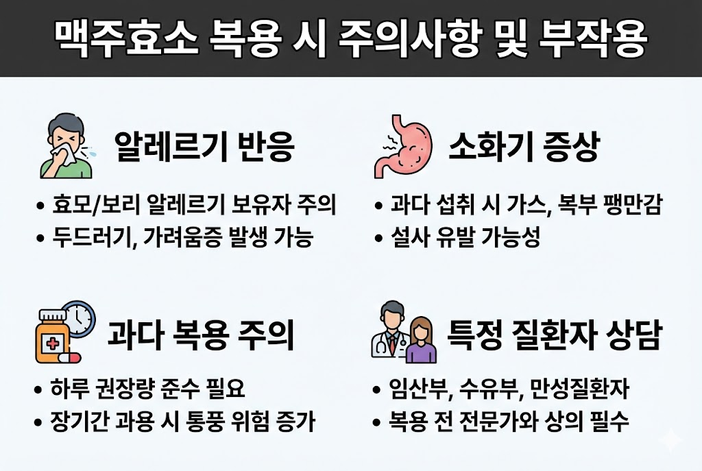 가장 주의해야 할 분들은 바로 **통풍 환자**입니다. 맥주효소의 원료인 맥주효모에는 '퓨린(Purine)'이라는 성분이 매우 풍부합니다. 퓨린은 체내에서 요산으로 변하는데, 요산 수치가 높아지면 통풍 증상을 악화시킬 수 있습니다.