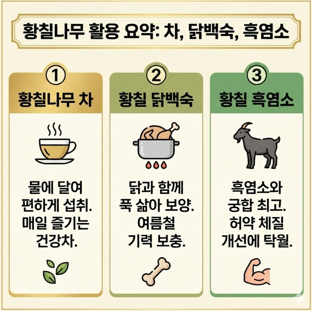 - 시너지 효과: 흑염소의 따뜻한 성질과 황칠의 혈액 순환 효과가 만나 기력 회복 속도를 높입니다.