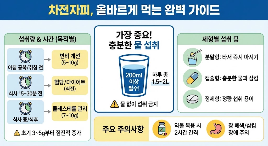 차전자피는 충분한 물(200ml 이상)과 함께 섭취하는 것이 가장 중요합니다. 목적에 따라 아침 공복, 식전, 취침 전 등 복용 시간을 조절하고, 처음에는 소량(3~5g)부터 시작하여 점차 늘려가세요.