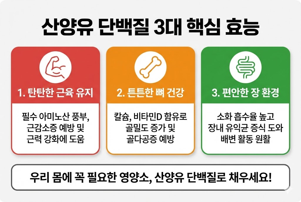 산양유에는 유익균의 먹이가 되는 **올리고당** 성분이 일반 우유보다 약 8배나 많이 들어있습니다. 이는 장 내 환경을 건강하게 만들어 배변 활동을 원활하게 하고 면역 세포의 약 70%가 집중된 장의 면역력을 높여주는 역할을 합니다. 평소 소화가 잘 안 되거나 장이 예민한 분들에게 산양유 단백질이 추천되는 핵심적인 이유입니다.