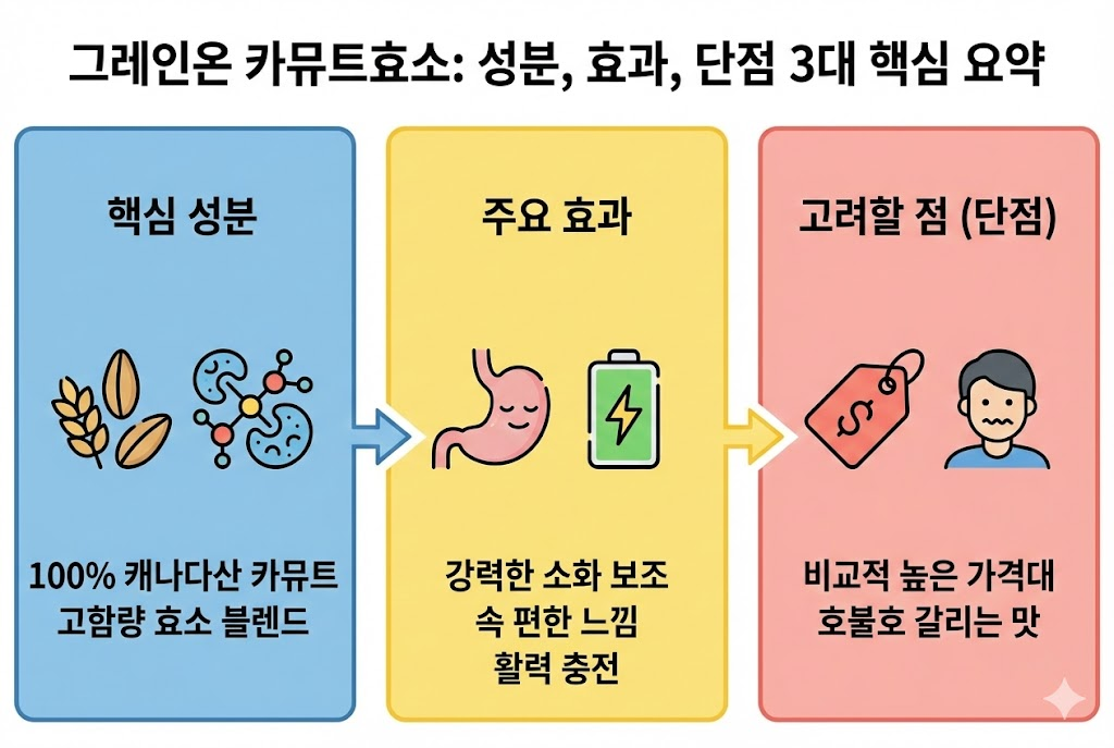 그레인온 카뮤트효소의 가장 큰 장벽은 역시 **가격**입니다. 저가형 효소들에 비해 확실히 가격대가 높게 형성되어 있어 장기 복용 시 부담이 될 수 있습니다. 또한, 맛있게 만들기 위해 스테비아나 향료가 들어가는데, 아주 예민한 분들은 "인공적인 단맛이 느껴진다"라고 평가하기도 합니다.