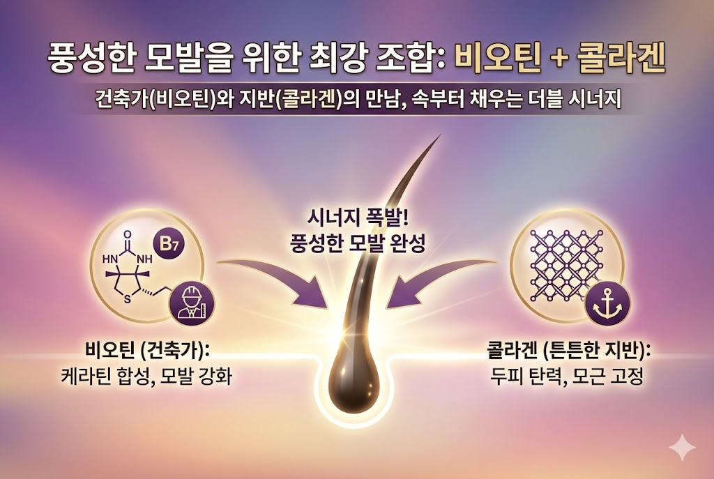 비오틴이 머리카락 자체를 튼튼하게 만든다면, 콜라겐은 머리카락이 잘 자랄 수 있는 환경을 만듭니다. 즉, **비오틴은 건축 자재, 콜라겐은 튼튼한 지반**인 셈이죠. 이 둘을 함께 섭취하면 모발의 생성부터 유지까지 전 과정을 케어할 수 있어 단독 섭취보다 훨씬 빠른 개선 효과를 기대할 수 있습니다.