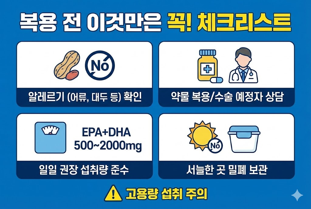 하이퍼셀 오메가3는 기술적으로 진보된 훌륭한 영양제이지만, 안전한 복용이 전제될 때 비로소 가치가 있습니다. 오늘 알려드린 부작용과 주의사항을 꼼꼼히 체크하여, 건강을 해치는 일 없이 스마트하게 활력을 챙기시길 바랍니다.