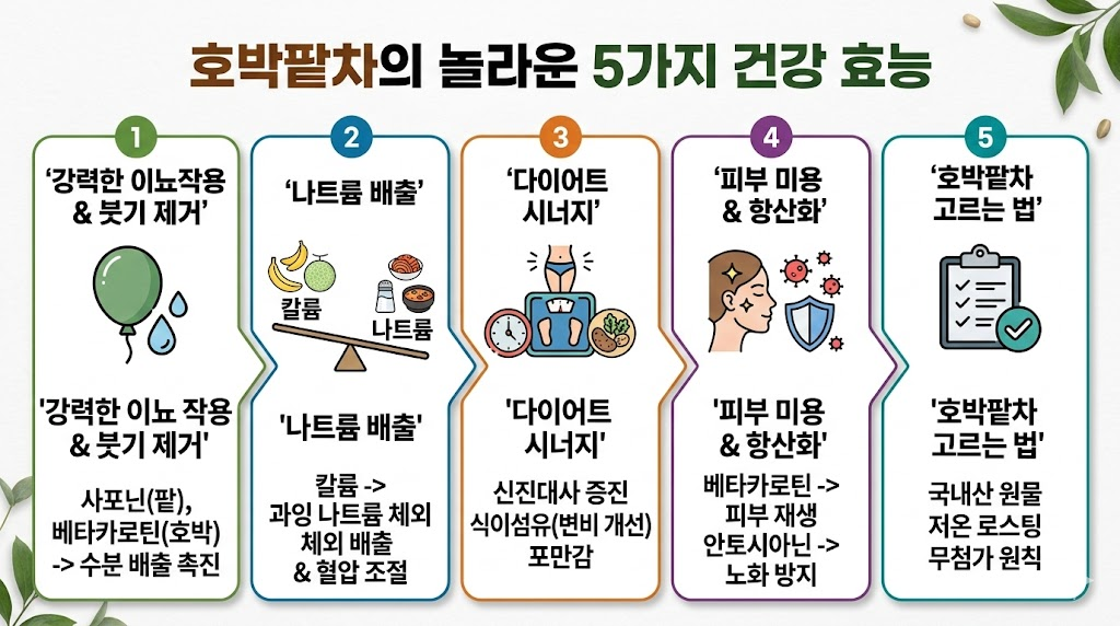 호박팥차는 붓기 제거와 이뇨 작용뿐만 아니라 나트륨 배출, 항산화 작용까지 챙길 수 있는 현대인의 '웰빙 필수템'입니다. 단순히 일시적인 붓기를 빼는 것을 넘어, 꾸준히 섭취하면 몸의 순환 체계를 바로잡는 데 큰 도움을 줄 수 있습니다.
