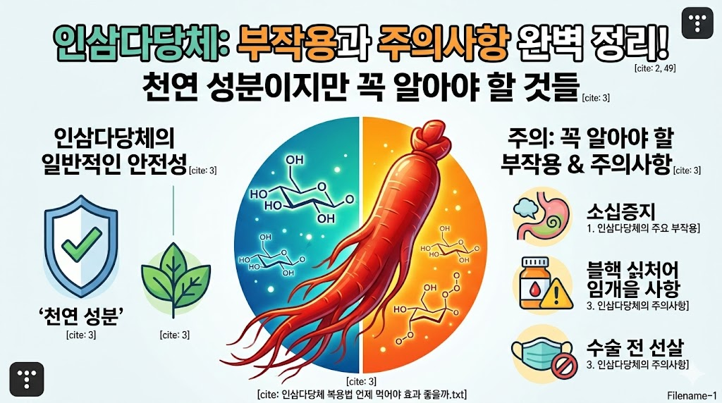 인삼다당체는 **'인삼의 안전한 진화'**라고 불릴 만큼 부작용이 적고 우수한 성분입니다. 하지만 개인의 체질과 건강 상태에 따라 반응은 천차만별일 수 있습니다.