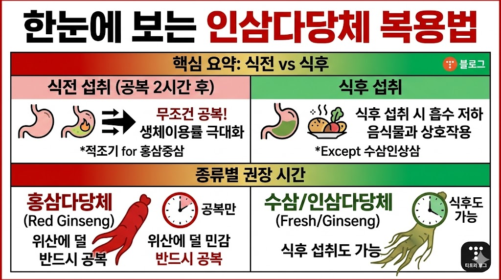 인삼다당체 복용법의 핵심은 **'공복 유지'**와 **'미온수 사용'**입니다. 이 두 가지만 잘 지켜도 인삼다당체가 가진 강력한 면역 조절 기능을 내 몸이 온전히 받아들일 수 있습니다.