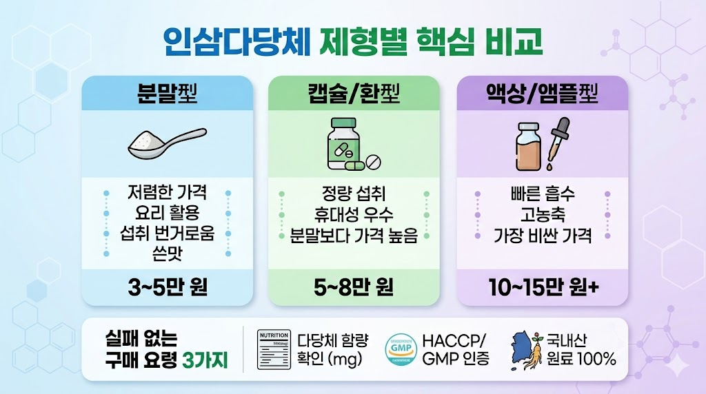 인삼다당체의 효능이 널리 알려지면서 시중에는 정말 다양한 형태의 제품들이 출시되어 있습니다. 하지만 소비자의 고민은 여기서 시작됩니다. "왜 어떤 건 한 달에 3만 원인데, 어떤 건 10만 원이 넘지?" 혹은 "분말이 좋을까, 액상이 좋을까?" 하는 의문들이죠.
