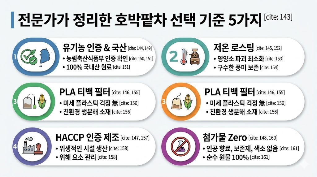 호박팥차를 선택할 때 가장 중요한 것은 결국 **'신뢰할 수 있는 원료'와 '안전한 공정'**입니다. 유기농 국내산 원료, 저온 로스팅, 친환경 PLA 필터 이 세 가지만 기억하셔도 시중의 저가형 제품과는 차원이 다른 프리미엄급 차를 고르실 수 있습니다.