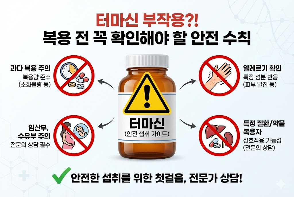 아무리 몸에 좋은 영양제라도 내 몸에 맞지 않으면 독이 될 수 있습니다. 관절 건강의 구원자로 불리는 **터마신(Turmacin)** 역시 마찬가지입니다. 천연 강황 성분이라 대체로 안전한 것으로 알려져 있지만, 체질이나 복용 중인 약물에 따라 주의해야 할 점이 분명히 존재합니다. 오늘은 터마신 복용 전 반드시 체크해야 할 부작용과 주의사항을 꼼꼼히 짚어 드립니다.