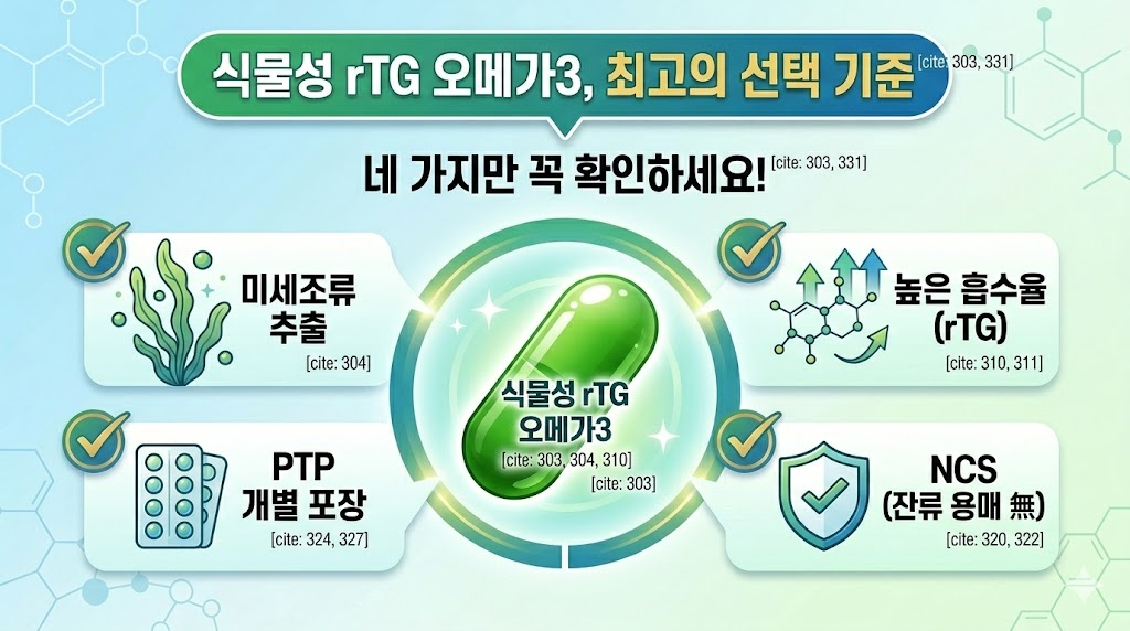 식물성 알티지 오메가3를 고를 때는 **'초임계 추출, rTG형, 식물성 캡슐, 높은 순도, PTP 포장'** 이 5가지 키워드만 기억하세요. 광고의 화려한 이미지보다 성분표 뒤에 숨겨진 진실을 보는 안목이 여러분의 건강을 지킵니다.