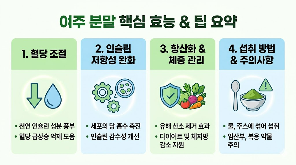 여주 분말은 자연이 준 가장 강력한 혈당 관리 도구 중 하나입니다. 꾸준한 여주 분말 섭취와 함께 올바른 식습관을 병행한다면, 당뇨라는 무거운 짐을 한결 가볍게 덜어낼 수 있을 것입니다. 오늘 정리해 드린 정보가 여러분의 건강한 혈당 관리에 큰 도움이 되길 바랍니다. 오늘 정보가 유익하셨다면 주변에도 널리 공유해 주세요!