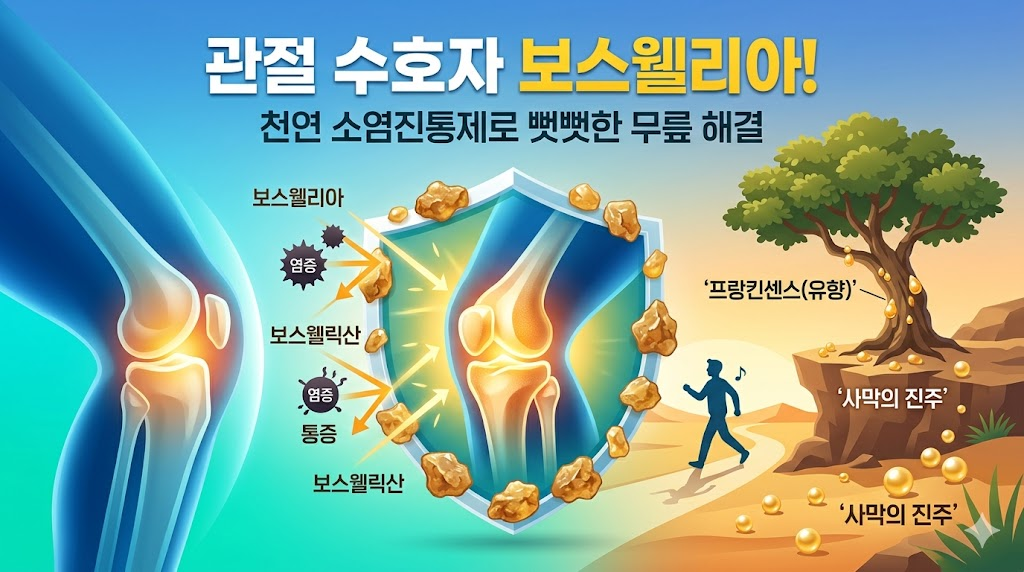 보스웰리아는 무릎 건강을 지키기 위한 인내의 열매이자 사막이 준 선물입니다. 아픈 무릎을 참기만 하기보다, 강력한 보스웰릭산의 힘을 통해 다시 활기차게 걷는 즐거움을 되찾아보세요. 오늘 정리해 드린 정보가 여러분의 가벼운 발걸음에 큰 도움이 되길 바랍니다!