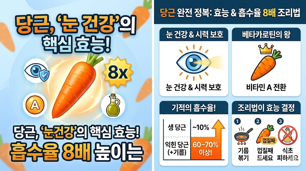 흔히 '눈 건강' 하면 가장 먼저 떠오르는 채소, 바로 당근(Carrot)입니다. 당근의 선명한 주황색은 건강한 생명력의 상징이기도 한데요. 하지만 당근을 그냥 생으로 씹어 먹는 것만으로는 그 속에 든 보석 같은 영양소인 베타카로틴을 충분히 얻기 어렵습니다. 오늘은 당근의 핵심 효능과 흡수율을 8배까지 높이는 기적의 조리법을 완벽하게 정리해 드립니다.