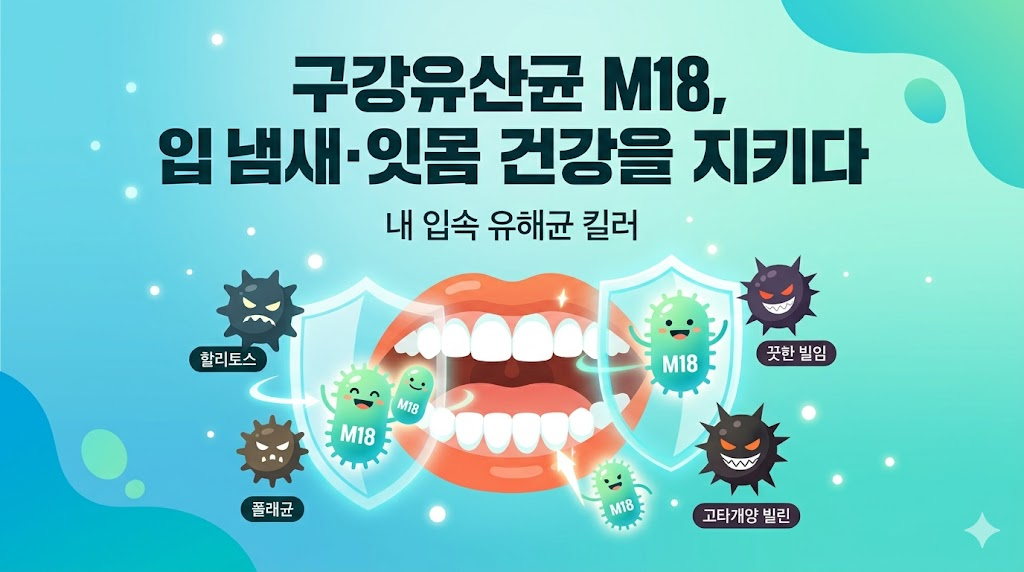 양치를 꼼꼼히 해도 금방 입안이 텁텁해지거나 지독한 입냄새 때문에 고민이신가요? 최근 단순한 가글이나 치약으로는 해결되지 않는 구강 문제를 근본적으로 다스리는 방법으로 구강유산균 M18이 떠오르고 있습니다. 입속에도 유익균과 유해균의 균형이 중요하다는 사실, 알고 계셨나요? 오늘은 구강유산균의 핵심 균주인 M18의 효능과 입냄새 제거 원리를 완벽하게 정리해 드립니다.
