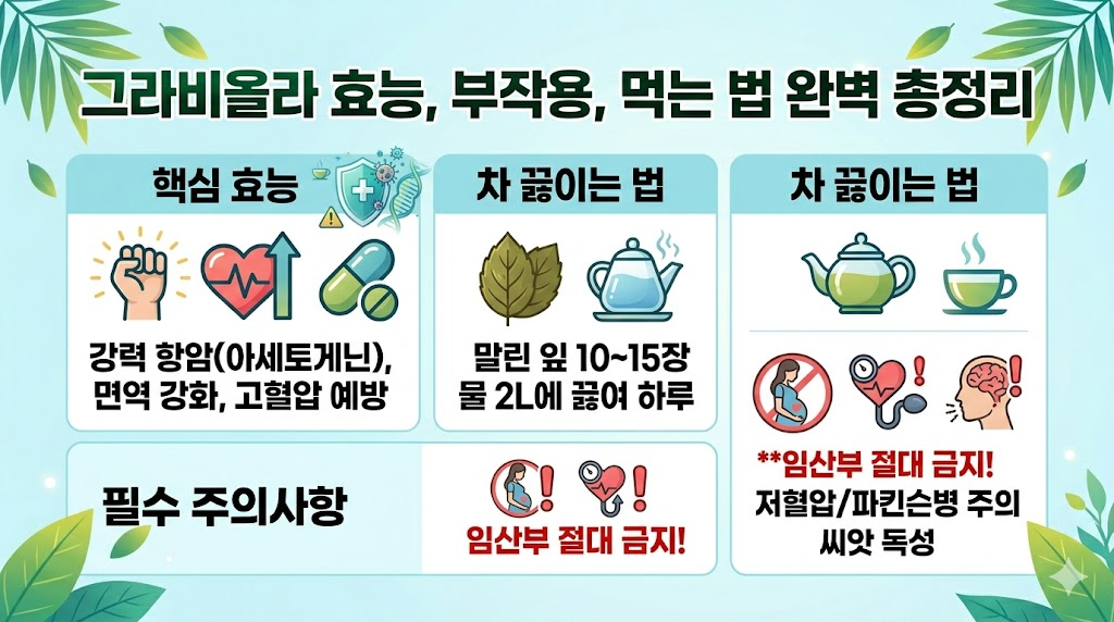 그라비올라는 잘 쓰면 명약이지만 잘못 쓰면 독이 될 수 있는 식물입니다. 강력한 항암 및 항염 효과를 누리되, 자신의 체질과 현재 건강 상태를 고려하여 정해진 양을 지키는 지혜가 필요합니다. 오늘 정리해 드린 정보를 통해 안전하고 건강하게 그라비올라를 활용해 보시길 바랍니다. 오늘 정보가 여러분의 활기찬 일상에 도움이 되길 바랍니다!