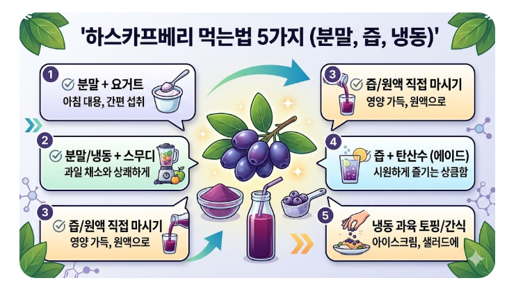 description: 안토시아닌이 풍부한 하스카프베리를 더 맛있고 건강하게 즐길 수 있는 5가지 구체적인 방법과 각 형태별 섭취 꿀팁을 상세히 정리해 드립니다.