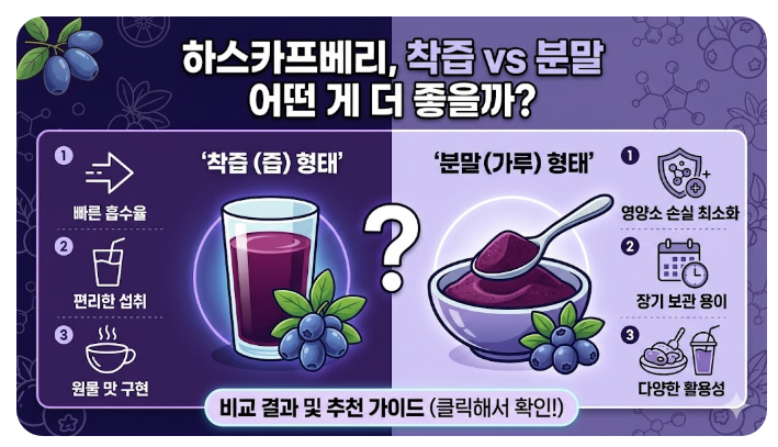 description: 하스카프베리를 가장 효과적으로 섭취하기 위해 착즙(즙)과 분말 중 어떤 형태가 영양 흡수와 편의성 면에서 유리한지 꼼꼼하게 비교 분석해 드립니다.