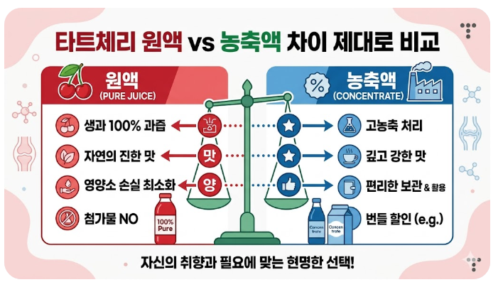 description: 타트체리 제품을 고를 때 가장 헷갈리는 원액과 농축액의 공정 차이, 영양 성분 보존율, 그리고 상황별 추천 제품까지 한눈에 비교해 드립니다.