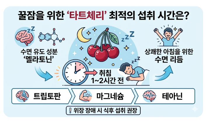 description: 타트체리의 멜라토닌 효과를 극대화하여 꿀잠을 자고 싶은 분들을 위해, 과학적인 근거를 바탕으로 한 최적의 섭취 시간과 주의사항을 알려드립니다.