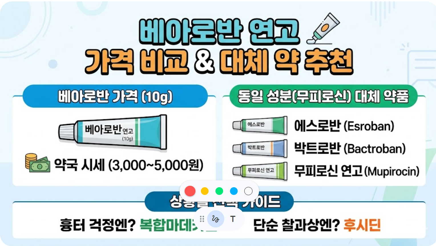 베아로반 연고는 저렴한 가격에 강력한 성능을 가진 상처 치료제입니다. 약국에서 3,000원~5,000원 내외면 쉽게 구할 수 있으며, 만약 베아로반이 없다면 성분이 같은 에스로반이나 무피로신 연고를 대체제로 선택하시면 됩니다. 상비약으로 하나쯤 구비해두면 갑작스러운 상처나 염증에 든든한 대비책이 될 것입니다.