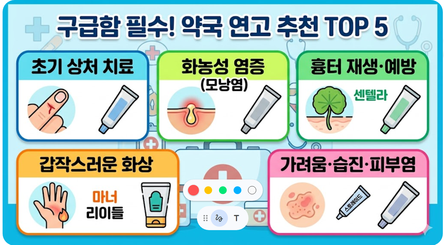상처의 종류(찰과상, 화상, 염증 등)에 따라 성분이 다른 연고를 사용해야 부작용을 줄이고 회복 속도를 높일 수 있습니다. 오늘 소개하는 TOP5 연고는 약사들이 가장 많이 추천하고 대중적으로 검증된 제품들로 구성했습니다.