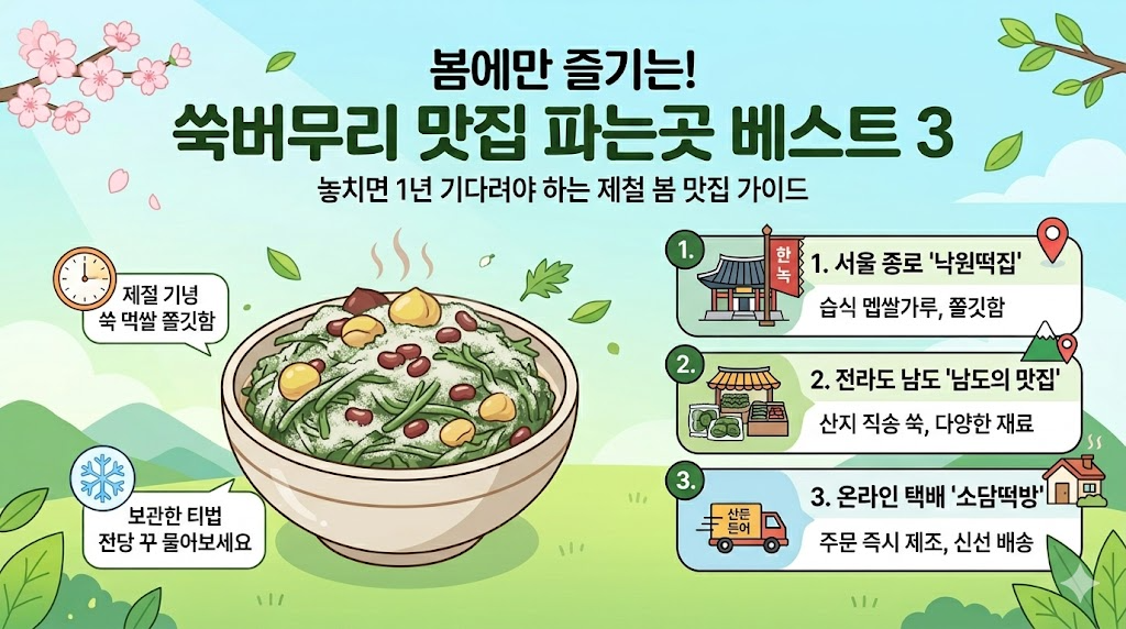 전국의 수많은 떡집 중에서도 특히 쑥버무리 맛집으로 입소문이 자자한 곳들은 무엇이 다를까요? 산지에서 갓 채취한 어린 쑥의 함량부터 비법 쌀가루의 조화까지, 한 입 먹는 순간 "이게 진짜 쑥버무리구나!" 탄성이 나오는 명소들을 선별했습니다. 지금부터 줄 서서 먹는 쑥버무리 파는곳 베스트 3를 소개합니다.